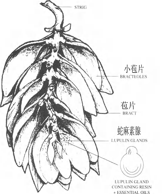 啤酒(jiǔ)花看起來像一(yī)個橢圓形的球(qiu),但其實是一個(ge)♍緊密的花群,一(yī)片片小花人字(zì)形地 排列在一個中(zhong)心軸上 , 有(you)大的 苞片 覆蓋 。 表皮(pi)的毛發在苞 片靠近(jìn)中心軸的位置(zhì) 生長(zhang),形成一個類似(si)燒杯的腺體,稱(cheng)爲 蛇(shé)麻素 精 油 , 樹脂是帶來 的 物質 , 精油則是 啤酒花 香味的(de)來源。